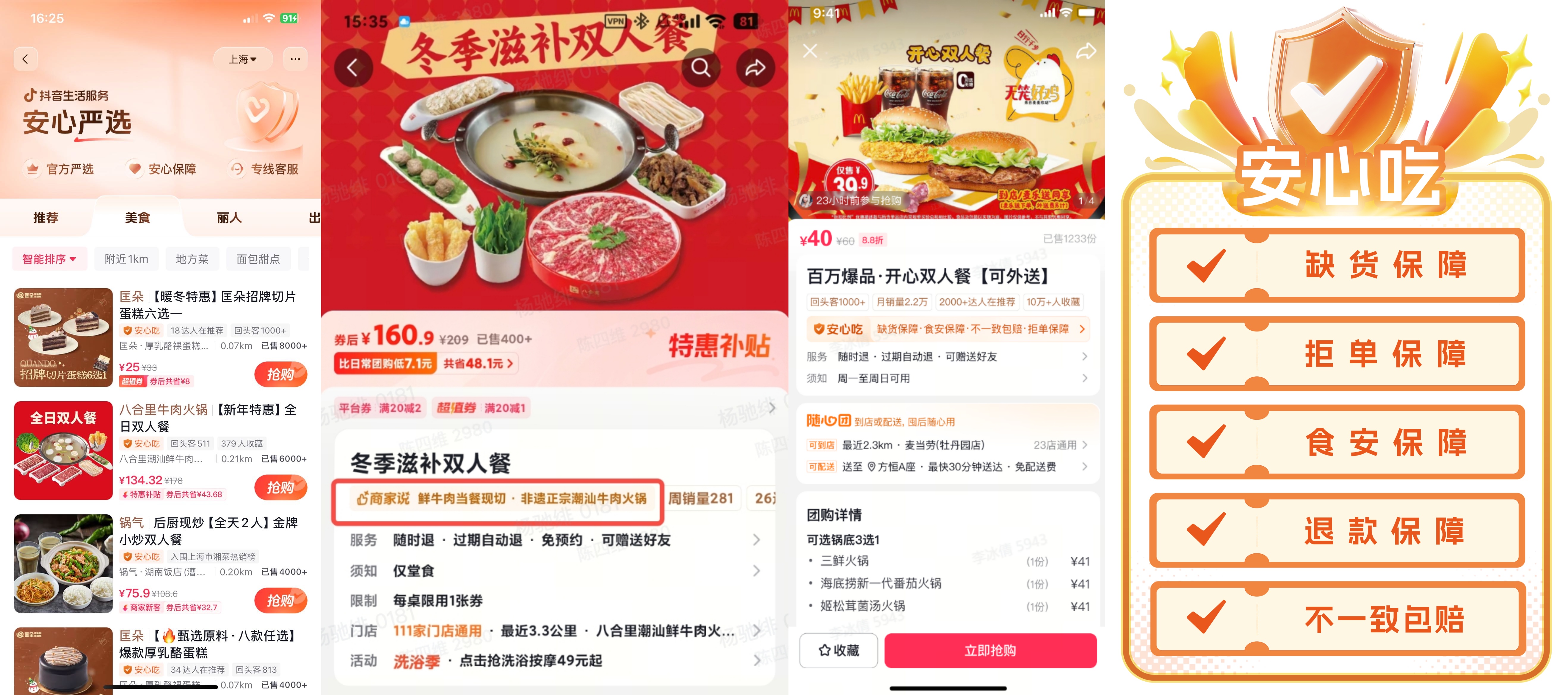 除了原产地食材新鲜,抖音生活服务与中国标准化研究院还推出「安心吃」服务保障品牌,通过将缺货保障、拒单保障、食安保障、退款保障、不一致包赔多重服务打包,形成「安心吃」统一标识,增强用户对入驻商家和打标商品的信任感。平台与商家通过给用户提供「安心吃」保障与“食品溯源”的双重承诺,让用户实现从产地到餐桌的安心。