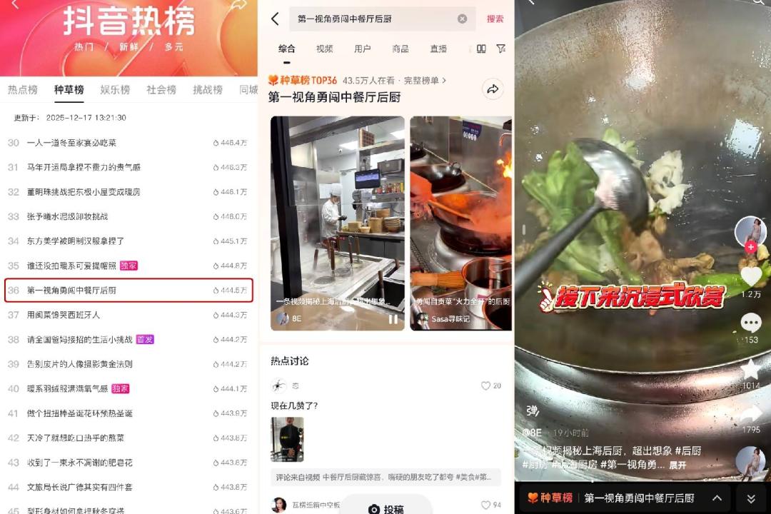 站内热门话题“第一视角勇闯中餐厅后厨”攀上抖音热榜,既满足了大众对餐饮后台的好奇心,也直观展现了明厨亮灶、制作流程,为商家诚信经营立标杆。话题上线便迅速冲至抖音种草榜TOP36,最高在线观看人数达79.8万,持续在榜超25小时。明星探店视频点赞超5万,达人相关视频总点赞近10万,总互动量突破15万,形成现象级传播热度。